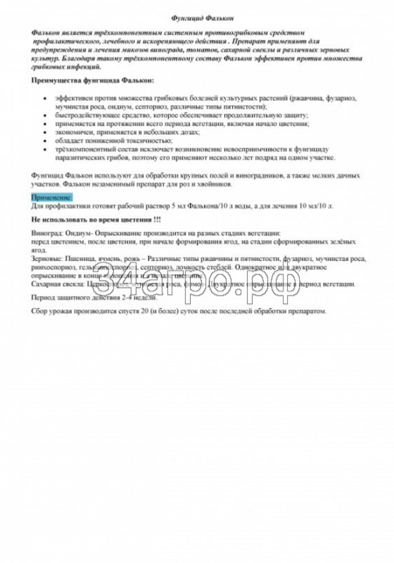 •    возможность использования препарата «Фалькон» для ранних профилактических обработок или обработок при первых признаках поражения, когда сложно диагностировать патогены;