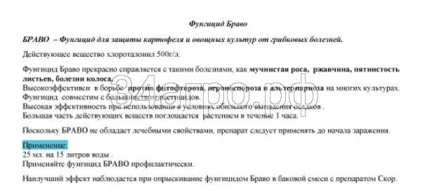 Контактный фунгицид широкого спектра действия с выраженными защитными свойствами, эффективен при профилактическом применении против широкого спектра грибных заболеваний картофеля и овощных культур.