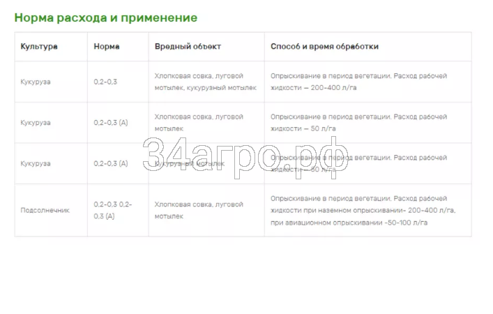 Кукуруза | 0,2-0,3 | Хлопковая совка, луговой мотылек, кукурузный мотылек | Опрыскивание в период вегетации. Расход рабочей жидкости – 200-400 л/га |